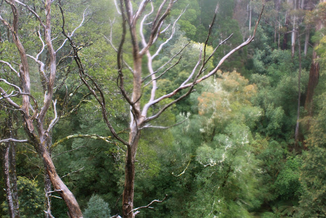 The privately-owned Otway Fly Treetop Walk is located in a rainforest near Australia's Otway National Park. Previously logged for timber, the area has been allowed to regrow. Only 50 years old now, one can only imagine how enormous the trees in the ancient forest must have been. Otway Fly offers an opportunity to go zip-lining between the treetops, walk on an elevated walkway or follow ground paths through the rainforest. It was chilly and raining the day we went—perfect conditions as the snakes would be snoozing and the rainforest would be rainforest-ing.