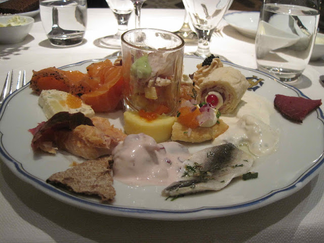 We were lucky enough to enjoy a fabulous Swedish Smörgåsbord. Among the delicacies were reindeer, herring, eel, salmon and bear. Yes, bear! It was my first time to eat bear—a tasty dark, smokey meat. It's that triangular sliver on the right side of the plate.