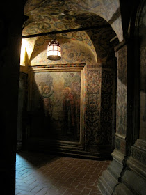 We are all familiar with the exterior of Moscow's St. Basil Cathedral but I've often wondered what the inside looked like. Could it possibly match the drama, the whimsey, the intrigue of the exterior? Recently, I had the opportunity to see—what a pleasant surprise! Each tower consists of a separate, tall and very narrow church, all clustered around a central church and joined by corridors. The interiors have undergone numerous restorations. I found the designs on the walls and ceilings of the corridors to be especially appealing.